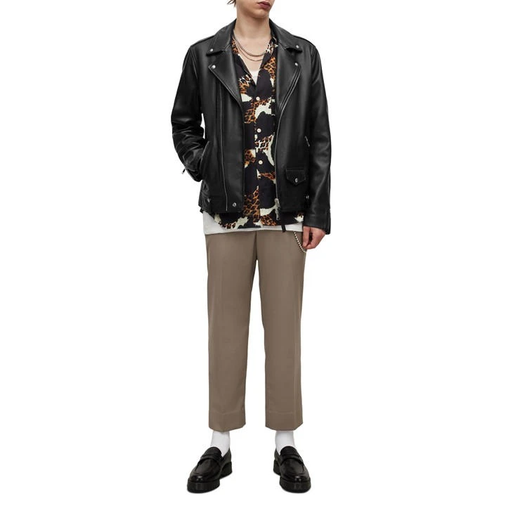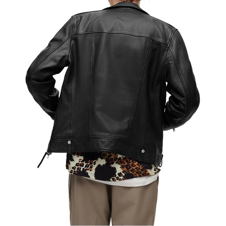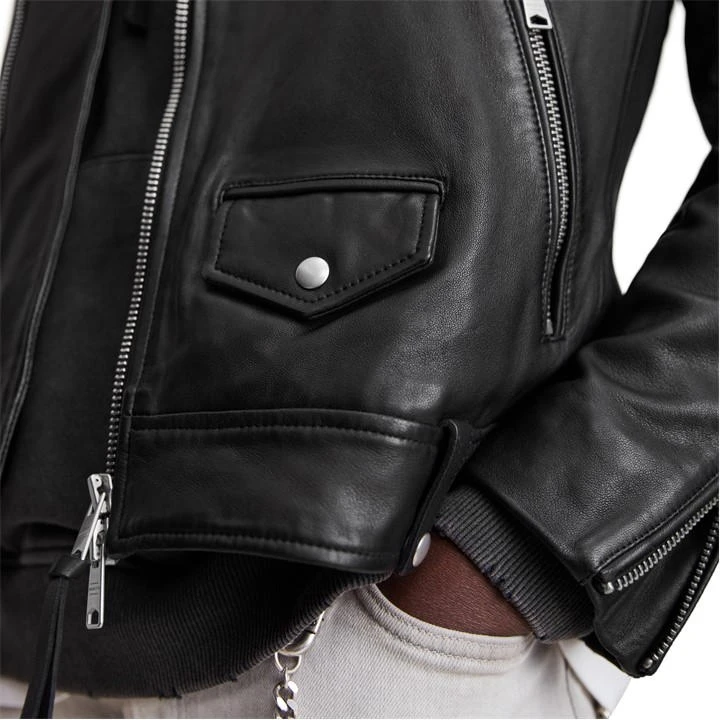 The AllSaints Milo Biker is made from classic, soft lamb leather with authentic biker jacket details including a ticket pocket and snap fastening hem loops. Asymmetric zip front. Two lower zip pockets. Long sleeve. Ticket pocket. Hem loops.