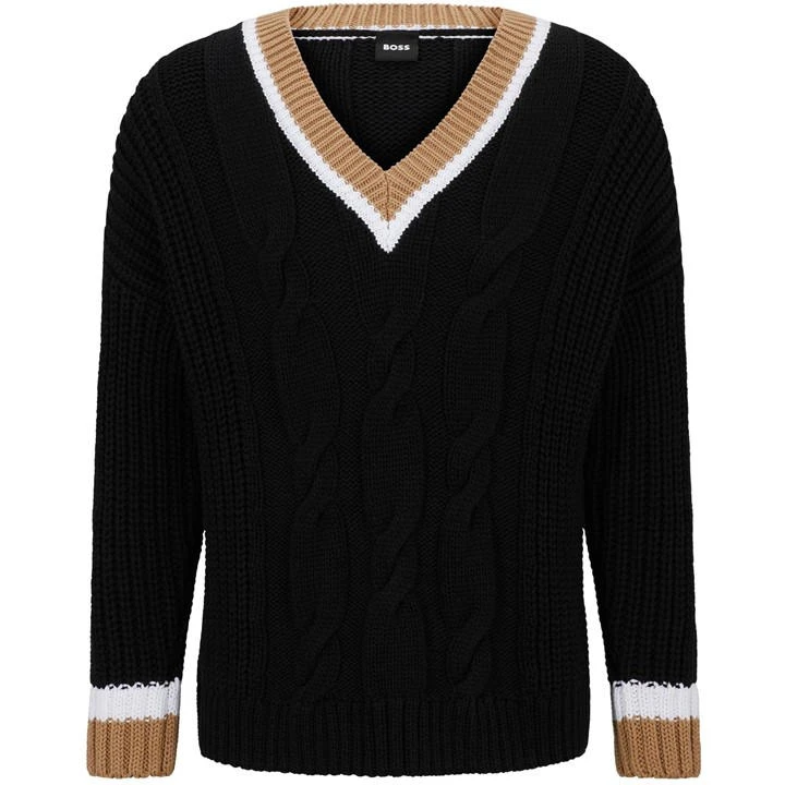 fashion cricket jumper – relaxed fit – all over chunky cable structure – colour blocking detailing at collar and cuffs – eye catching fashion piece