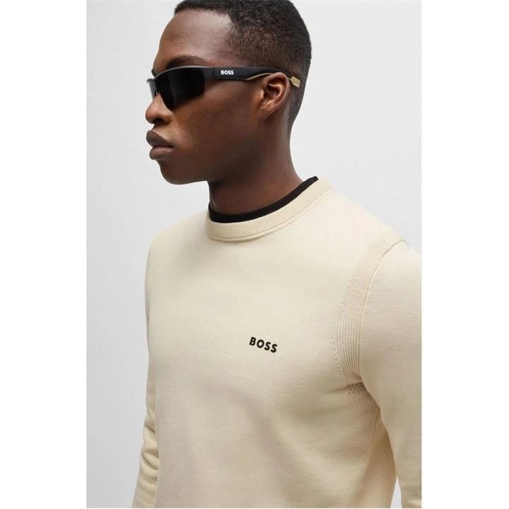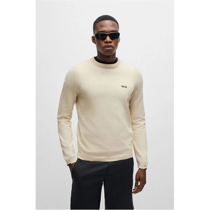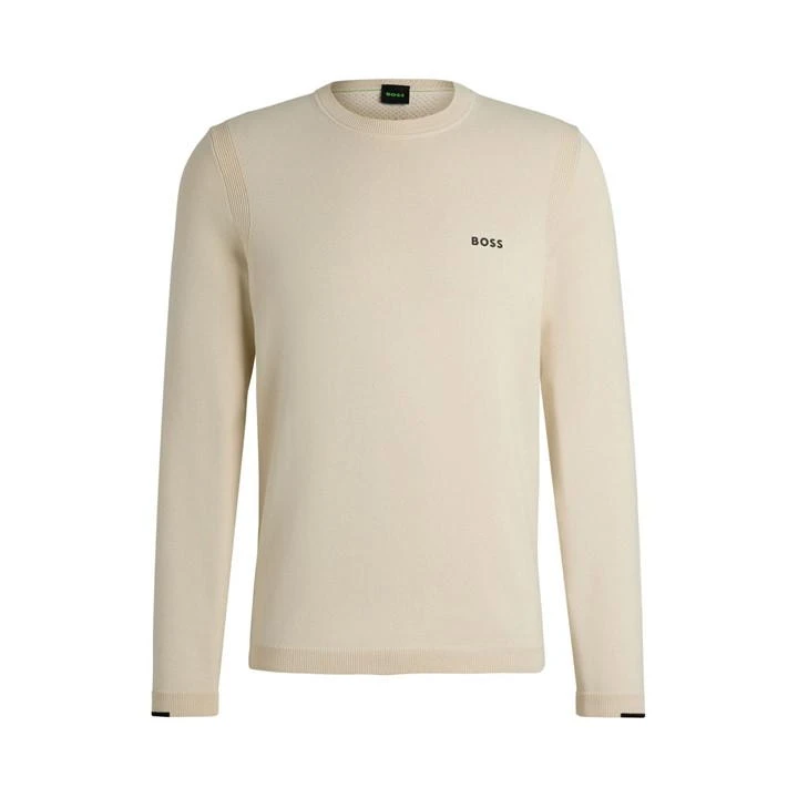 A distinctive sweater by BOSS Menswear. Cut to a regular fit this top is designed in stretch material with a contrast logo print. This product is partly made with organic cotton. Our organic standards do not allow the use of synthetic fertilisers pesticides or genetically modified seeds. crewneck – tech-flex cotton stretch knit – contrast HD logo print at left chest tonal to tipping detail – ergonomic moving ribbed seams for comfort and freedom of movement – integrated perforation structure at inner collar back and underarm for body ventilation