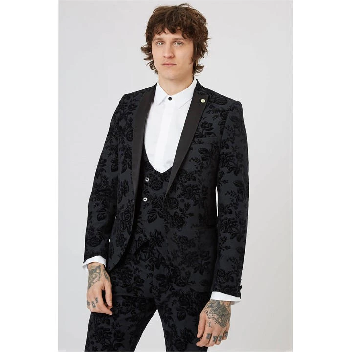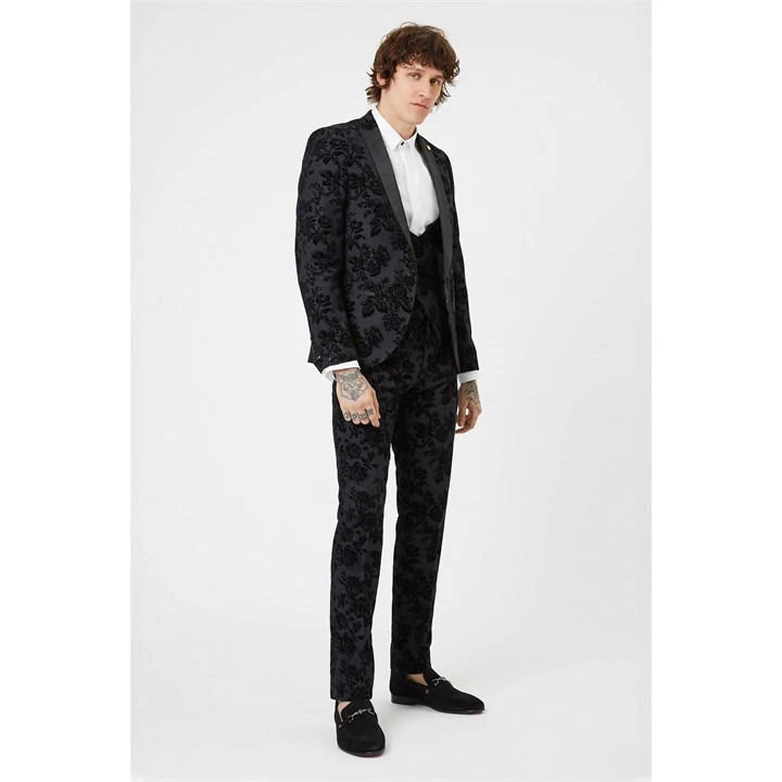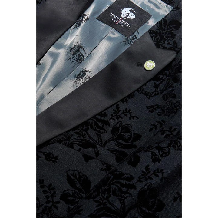 The Twisted Tailor Fleet Floral Tuxedo is the epitome of refined rebellion. This unique suit features a wool blend construction in a stretch fabric and contrast black sateen peak lapel. The jacket is crafted with straight flap pockets, double darts and 5 kissing buttons including the TT branded skull button. The black textured floral flocking adorns the suit, giving a darker edge to your evening wear ensemble. For maximum impact, pair it with the matching trousers and waistcoat, completing a look that commands attention and exudes confidence.
