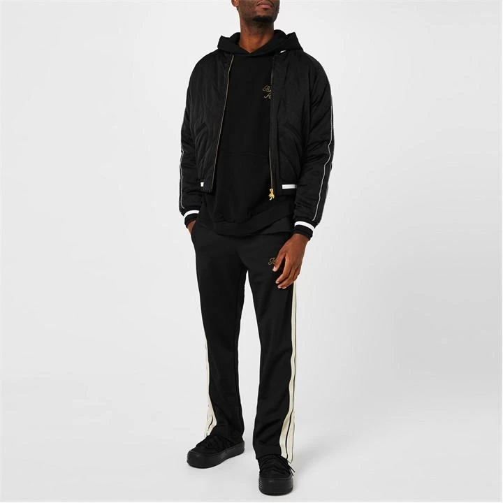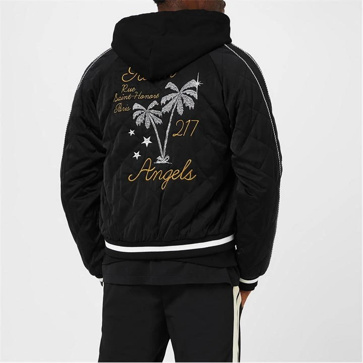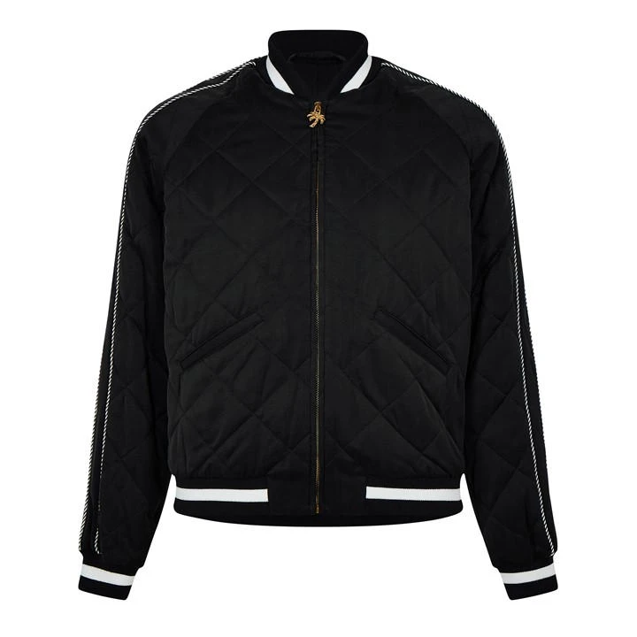 Introducing the Logo-Embroidered Quilted Jacket from Palm Angels, where luxury blends seamlessly with casual streetwear and a unique aesthetic that defies convention. Crafted from 100% cupro, a luxurious material that adds a subtle sheen and a soft touch to the jacket’s overall texture. The band collar and front zip fastening offer a sleek and contemporary edge, while the long sleeves and straight hem ensure practicality. With its black quilted texture and contrasting stripes, this jacket makes a bold statement, especially with the embroidered motif on the back. Suitable for a variety of occasions, channel your inner rebel and make a statement with Palm Angels.